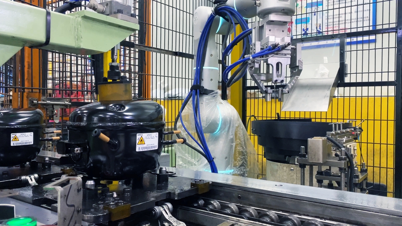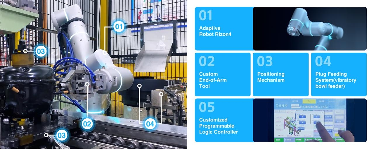 Flexiv’s solution supports multiple compressor models and five plug types. With drag-to-teach programming, a quick-change end-of-arm flange, and a touchscreen PLC with an adjustable insertion force from 15 to 100N, the system can be easily adapted to new compressor models or line adjustments.